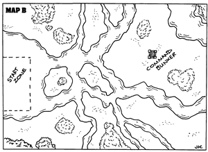 The Questron Federation forces must start in their start zone as shown on the map. The Cixerona rebels have a much wider choice in the placement of their forces and may place their forces anywhere in the playing area. The placing of these forces is essential to the defence of the rebel base. The only restriction is that the Command Bunker (the rebel base) must be placed as shown on the map.