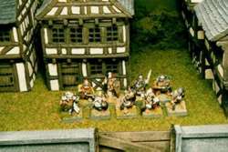 The local defence of the hamlet depends on these troops. There are ten militia and they are wearing leather armour and are armed with a range of hand-weapons from axes, swords to halberds and spears. All the militia have one action point.
