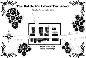 This skirmish scenario is set around the small hamlet of Lower Turnstool and the Dwarfs who reside their are about to be attacked by a goblin raiding party. Defending the hamlet are local militia, regular mountain troops and other villagers. Attacking is a goblin raiding party intent on ransacking the hamlet and all the other stuff that attacking troops do to ransacked towns and hamlets. Included are some simple skirmish rules to enable you to get fighting straight away.