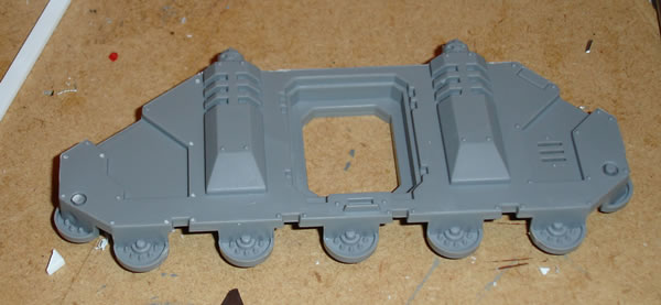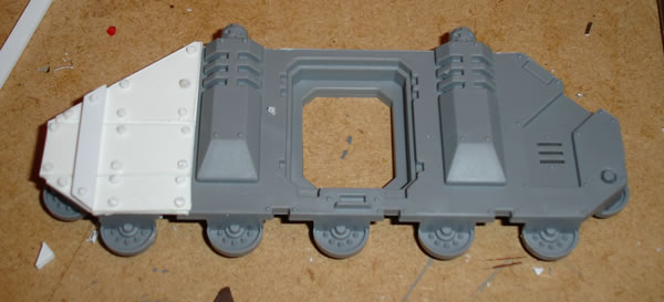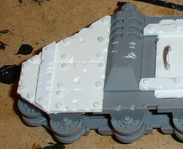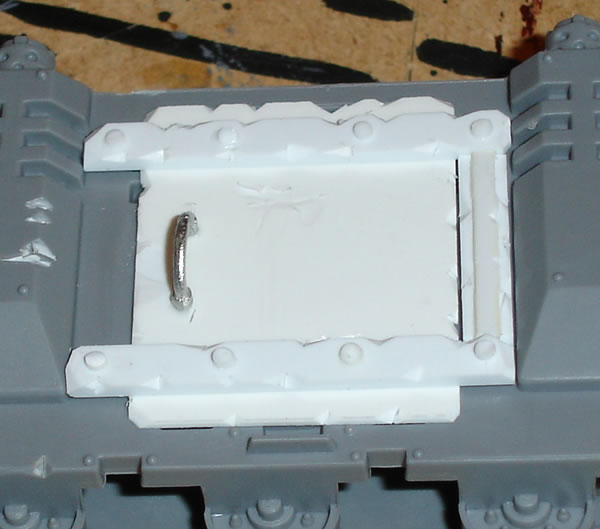 I then stuck down a piece of plasticard to which I added three panels and a covering strip. These were glued together using plastic cement glue. I then added Orky rivets using sliced plastic rod and stuck down with super glue.