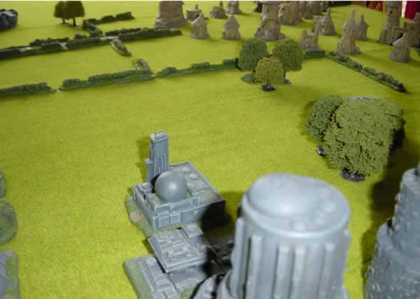 The battlefield from the Ork position, with a small village in the background and industrial units in the forground.