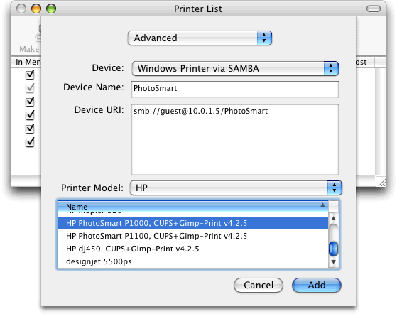 In this guide I am using an HP PhotoSmart P1000 printer on a XP PC and printing from a Mac running 10.3.x