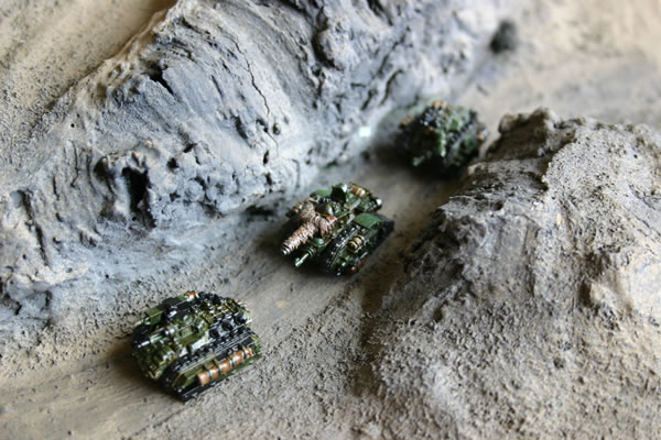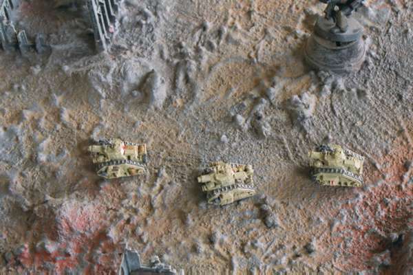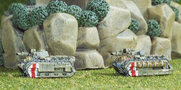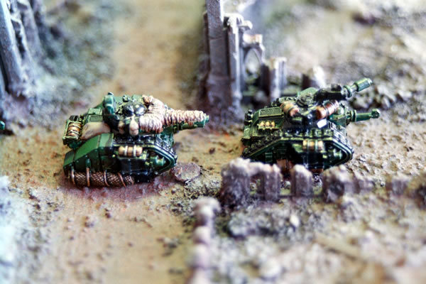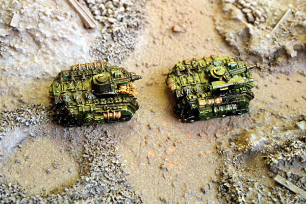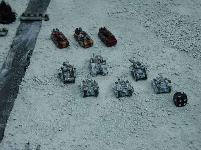 Leman Russ and Hellhound tanks cross the snowy fields to enage some Ork Battlewagonz.