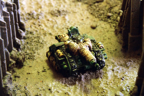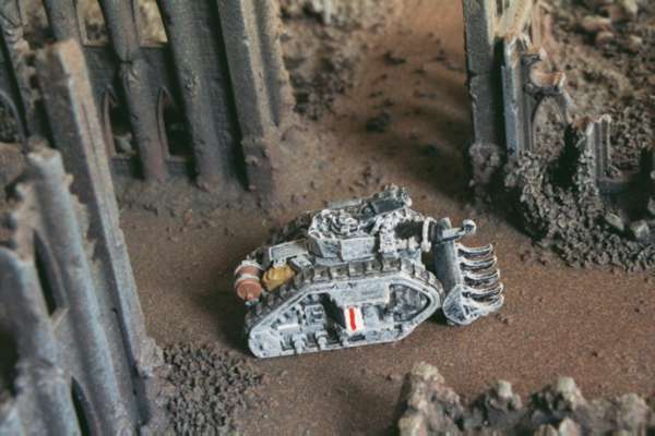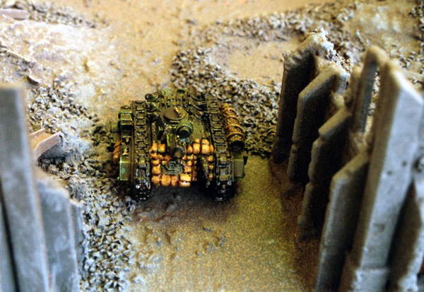 Imperial Leman Russ tanks supported by Chimeras and a Manticore move back through the ruins of an Imperial City...