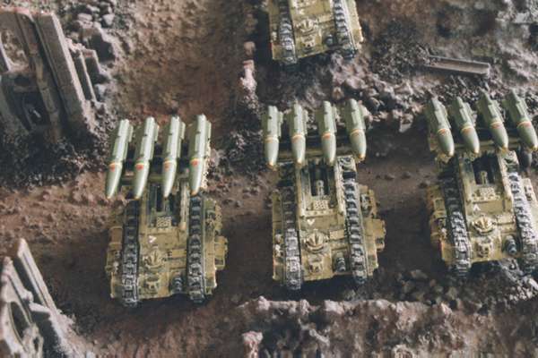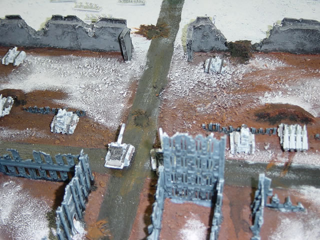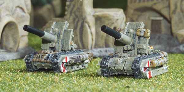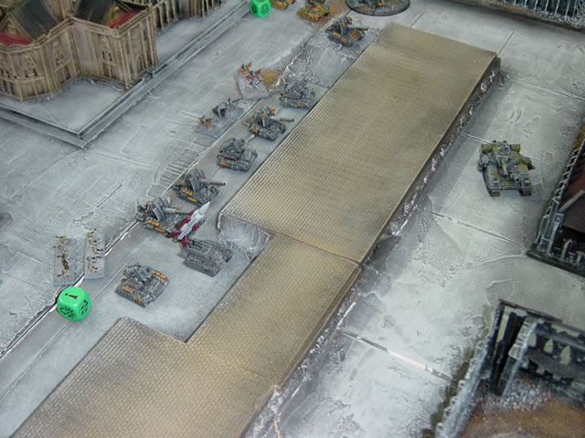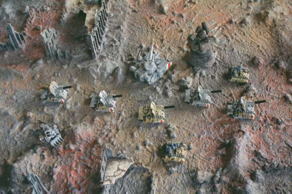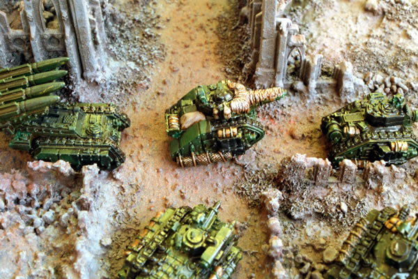 Imperial Leman Russ tanks supported by Chimeras and a Manticore move back through the ruins of an Imperial City...