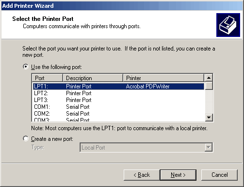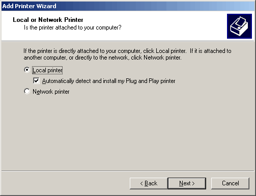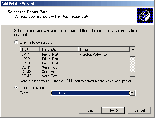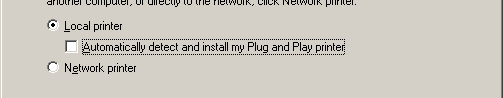 When prompted for Local or Network Printer, make sure the Local printer attached to this computer radio button is selected.