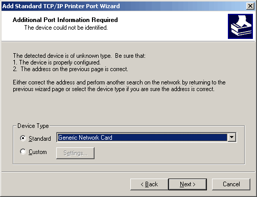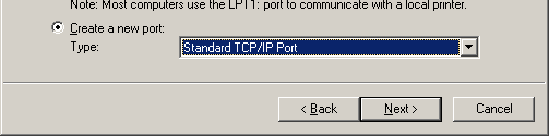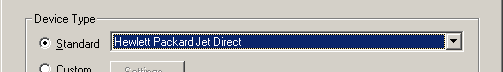 Make sure Standard was the radio button selected and then select Hewlett Packard Jet Direct in the drop down menu. Important, you must select Hewlett Packard Jet Direct regardless of which printer you actually have , even if it is an Epson or Canon.