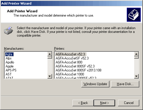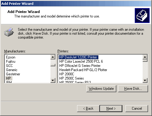 Select the printer type and model (or use the Have Disk... if applicable), in this example I am using a HP DeskJet 1220C.