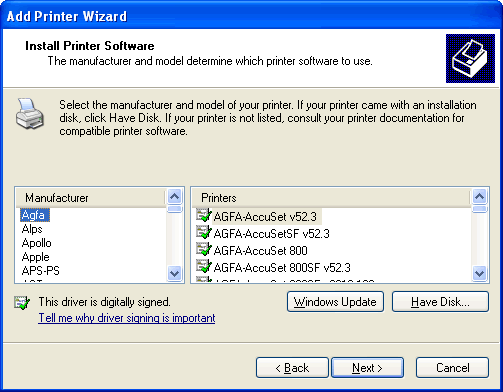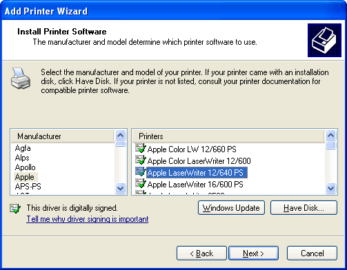 Choose the relevant Printer Driver (or click Have Disk and put in the relevant drivers disk). Note that you should only use the Windows driver if you have a Postscript printer.