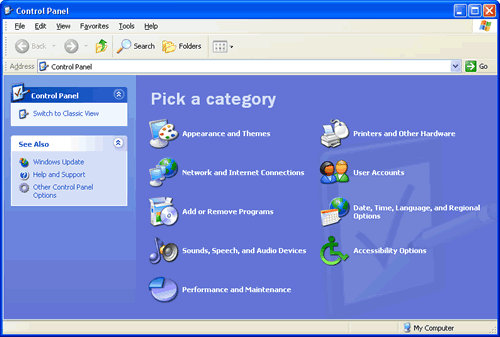 This screenshot shows the Control Panel in Category View, notes for people who use Classic View.