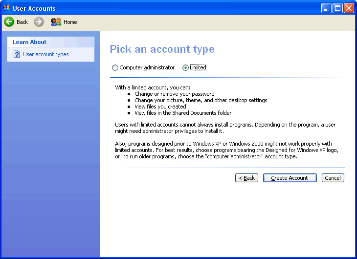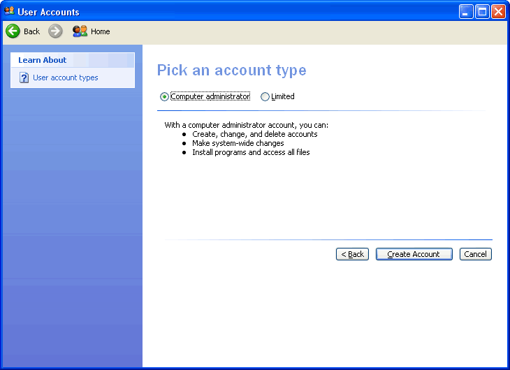 Though you can have this account have Computer administratio rights, it is probably best to make it a Limited account type.