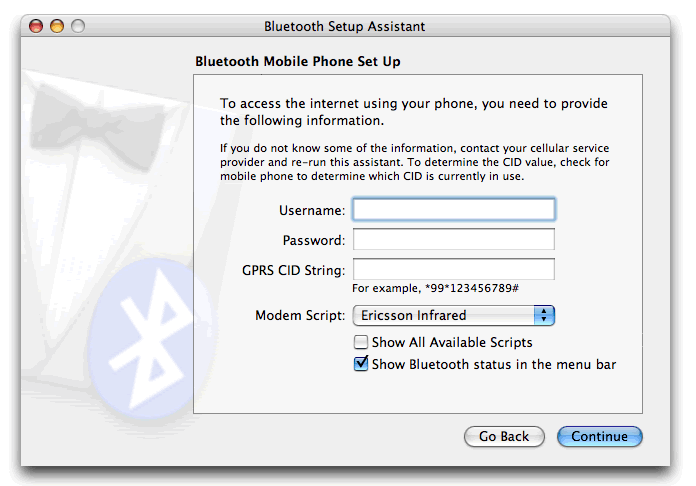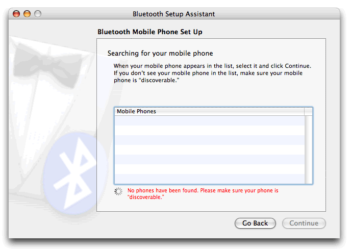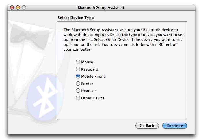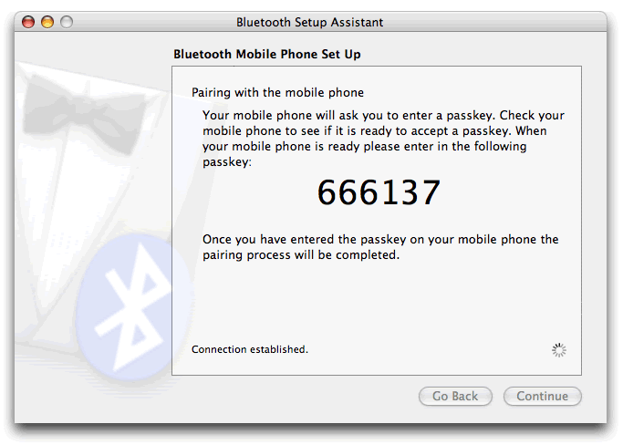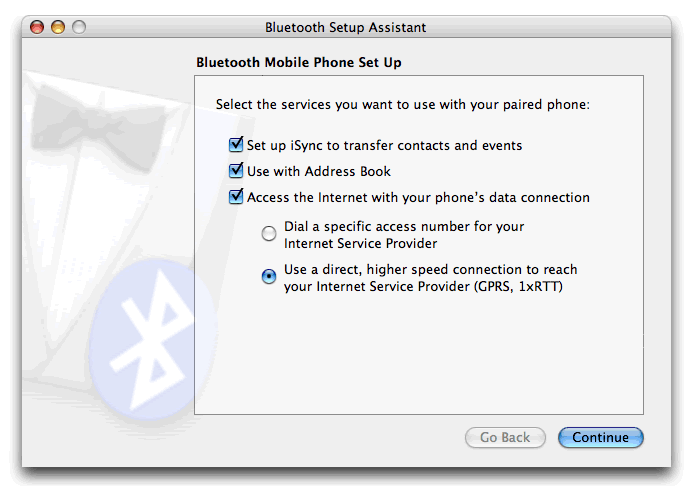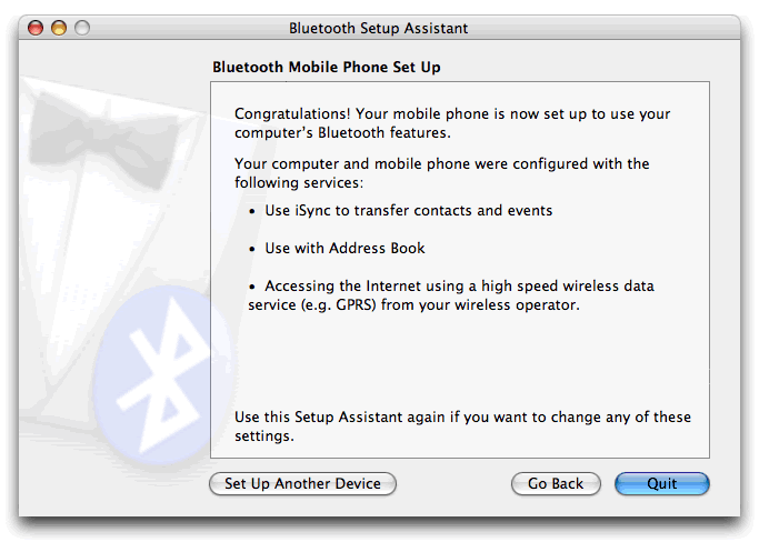You can at this point allow your phone to sync with the PowerBook to transfer contacts and use your phone with the Address Book - useful for sending SMS messages via your Mac as outlined on the O'Reilly website.