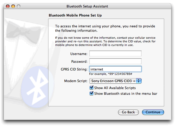 You will also need to download the Sony Ericsson modem scripts from Ross Barkman's website or you can download them from my mirror. You should copy the scripts into the Modem Scripts folder in the Library folder on the root driver - not in your user Library. These scripts work with the T39m, T68/T68i, T610, P800, P900, Z600 and should work with other Ericsson and Sony-Ericsson GPRS models.