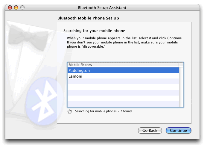Otherwise your PowerBook should find the phone, in this example the phone is called Paddington, most phones will probably be called by their model number, ie T610. As you can see in this example, the Mac has also found another phone whilst searching. In a busy area this may happen a lot.